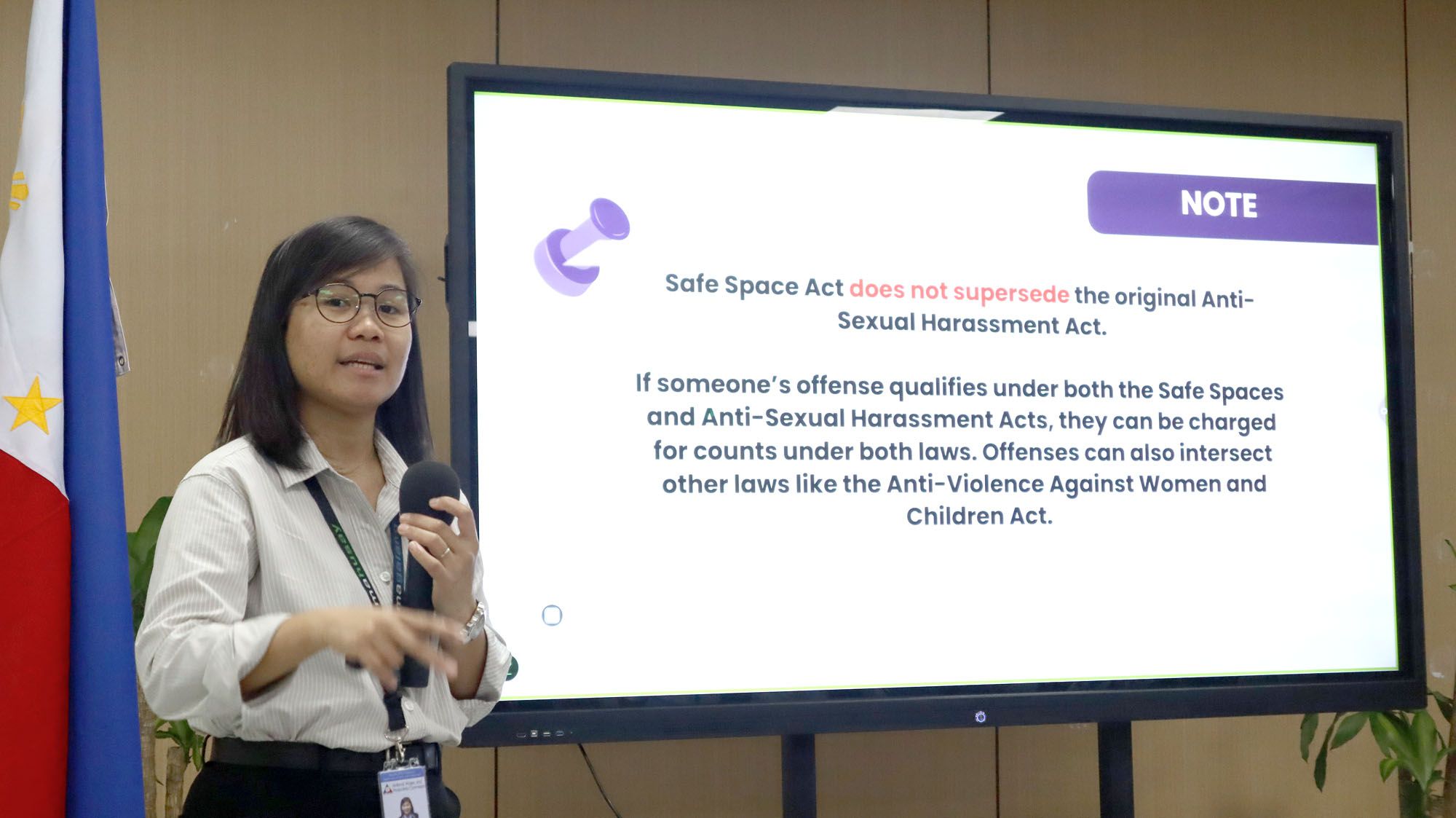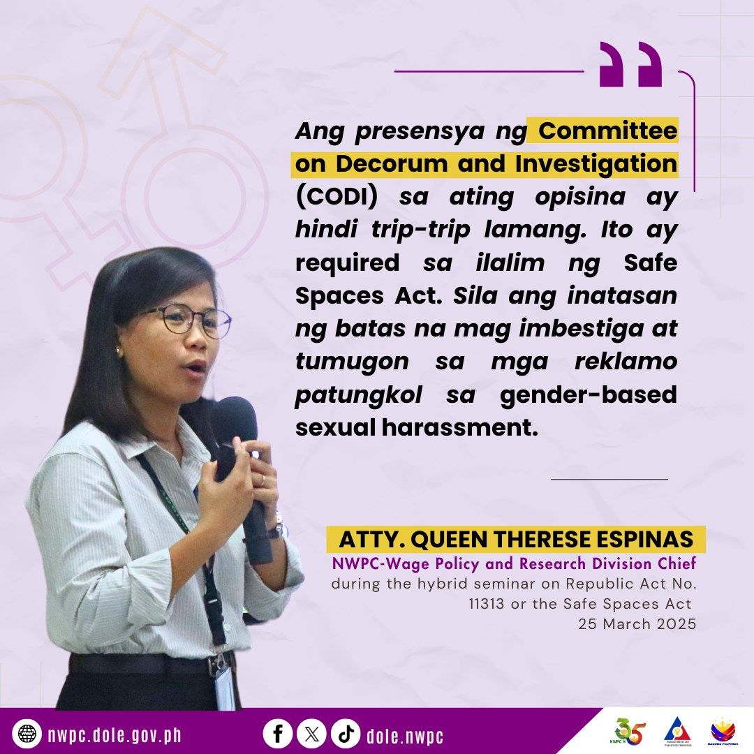 NWPC conducted its GAD Hybrid Seminar on Safe Spaces and Breastfeeding at the agency’s new office space at the Trium Square in Pasay City. This took place last March 25, 2025 tapping in-housed resource speakers such as Atty. Queen Therese D. Espinas and Director Grace N. Mana-ay-Badilla. This capacity-building activity is deemed hybrid as the RTWPBs also attended the seminar via online teleconferencing.