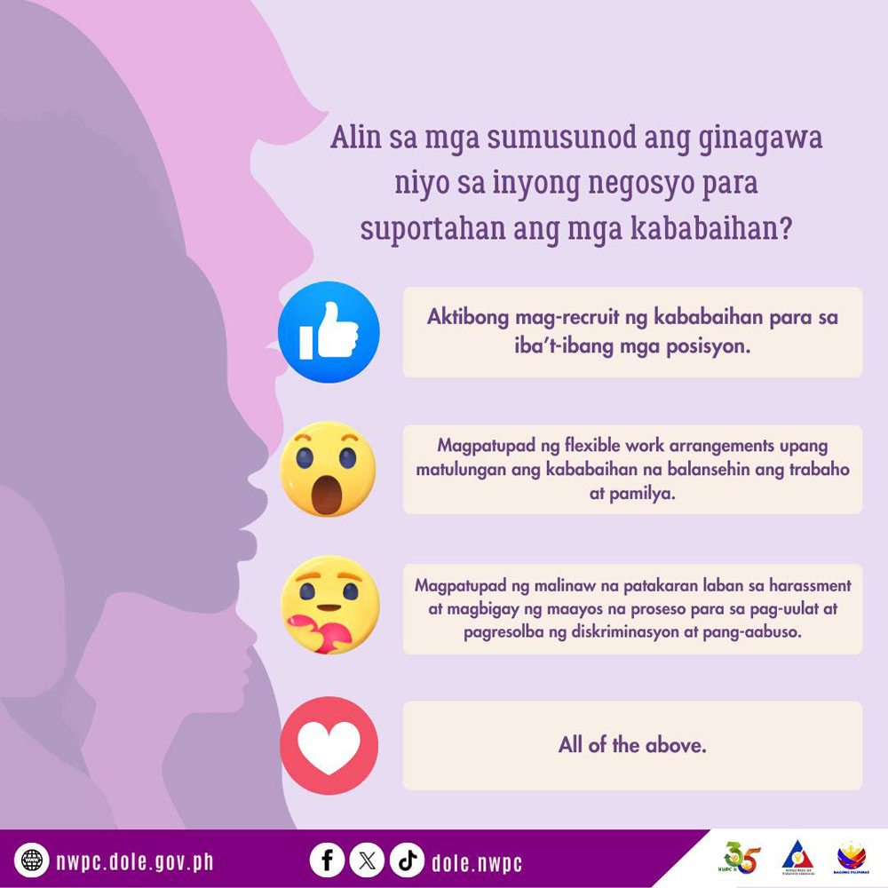 - Address gender issues of employees through promoting equitable and inclusive opportunities in the workplace towards safe working environment and family-life work balance; and