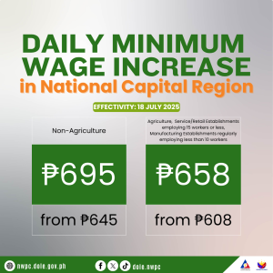 Around 1.2 million minimum wage earners in the National Capital Region (NCR)will receive a daily minimum wage increase of P50, Department of Labor and Employment (DOLE) Secretary Bienvenido E. Laguesma announced today. The increase, which was unanimously approved by the NCR Regional Tripartite Wages and Productivity Board (RTWPB) through wage order no. 26, is the highest ever granted by the NCR wage board and will bring the daily minimum wage rate in NCR from P645 to P695 for the non-agriculture sector, and from P608 to P658 for the agriculture sector, service and retail establishments employing 15 or less workers, and manufacturing establishments regularly employing less than 10 workers.