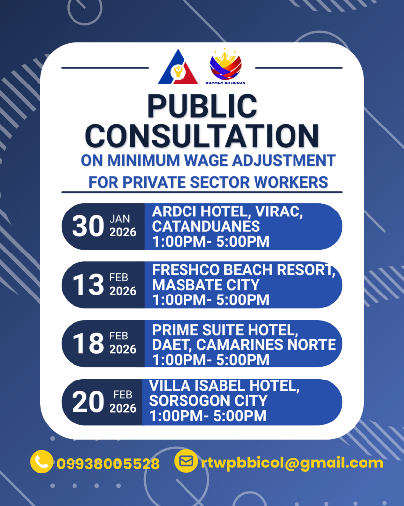 The RTWPB–Bicol announces the schedule of Public Consultations on the Proposed Wage Adjustment across selected provinces in the Bicol Region.